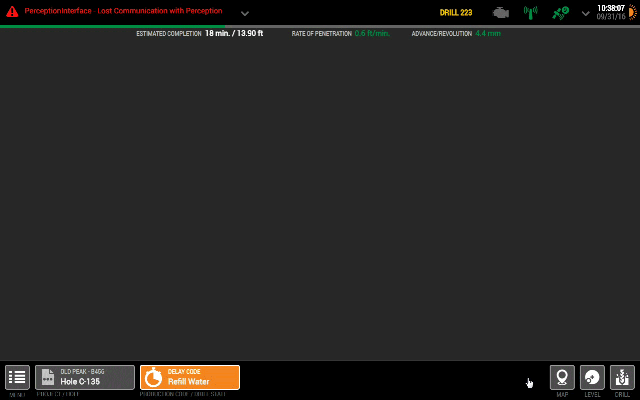 Key findings : operators look out the window, they feel and hear the machine more than they look at the display. We translate this by creating bolder gauges, visible in the peripherals. Based on the rock hardness, we added different bit animation to mimic the vibrations.