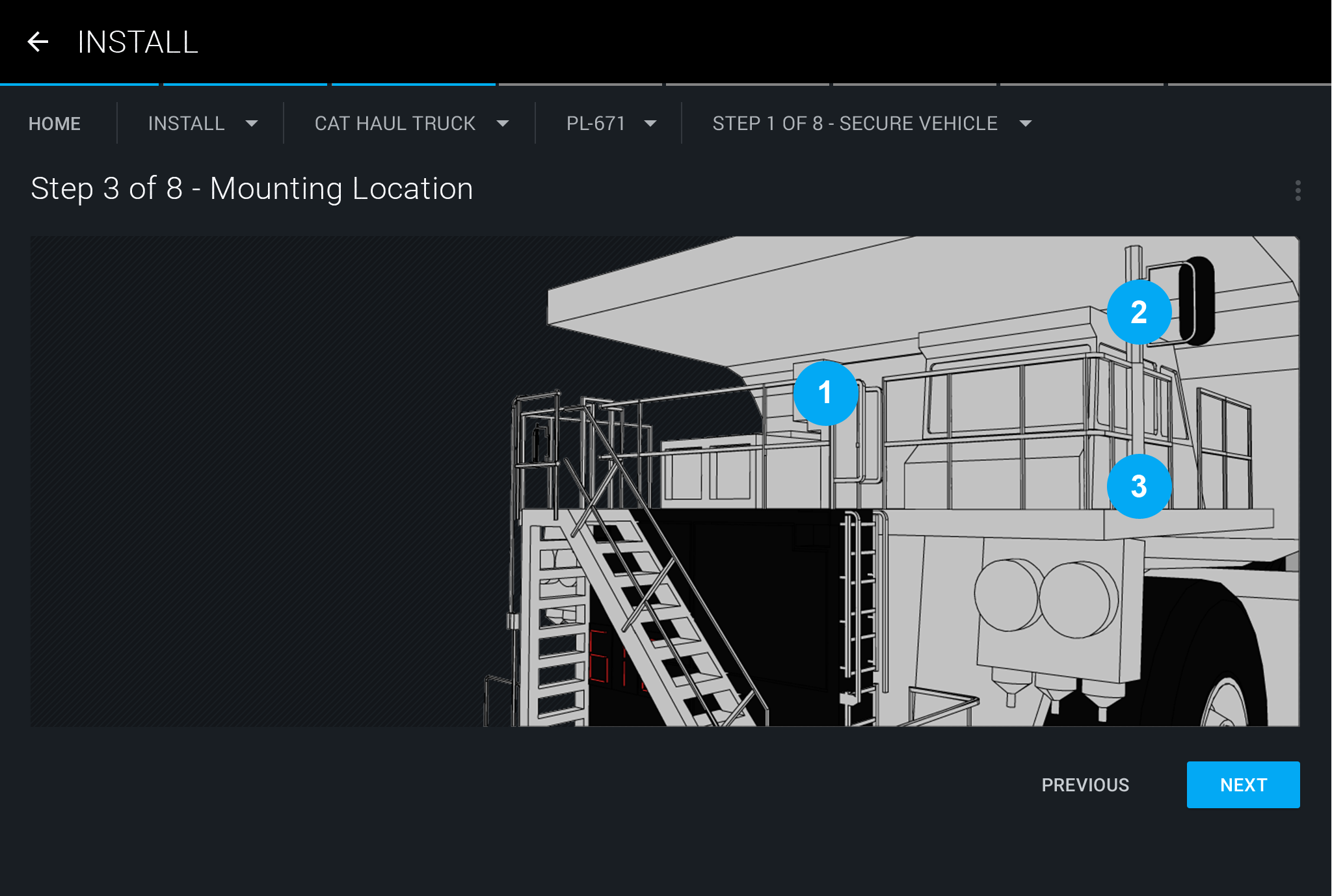Audience : Service technician requiring interactive equipment mounting instructions and fleet task progression display.